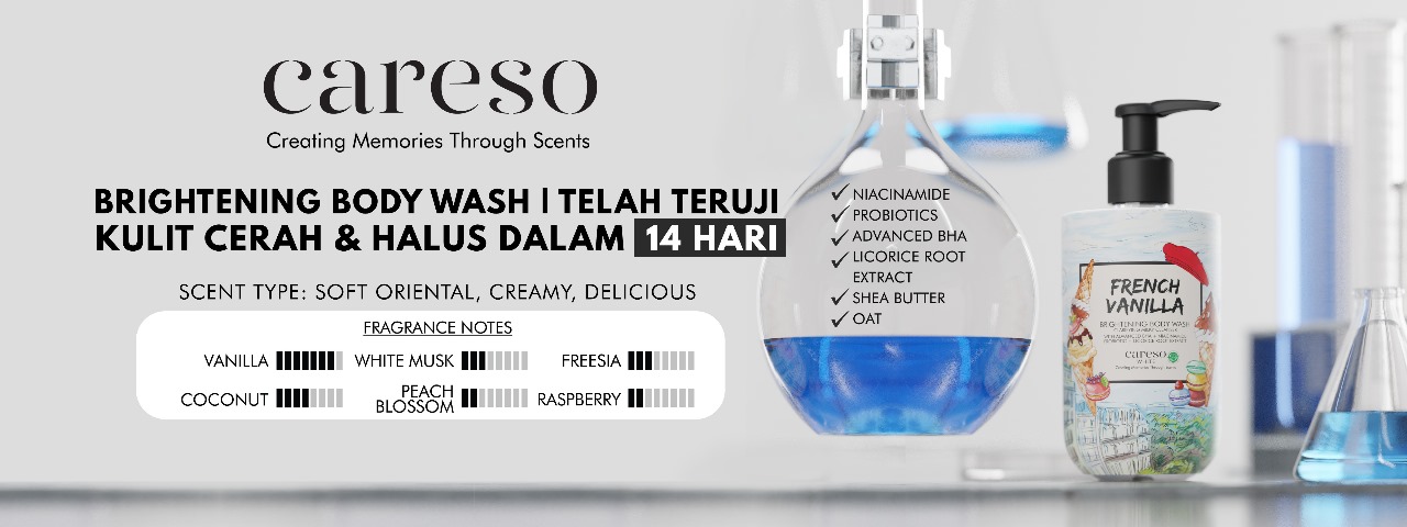 Sabun mandi yang dapat membersihkan dan mencerahkan kulit. Berfungsi memudarkan tanda gelap dan kulit kusam, untuk menghasilkan kulit yang lebih lembut, halus, dan tampak bercahaya. Sabun mandi ini menyeimbangkan mikrobioma dan memiliki ph seimbang untuk mendorong fungsi pelindung kulit yang sehat dan lembut. Aman untuk digunakan sehari-hari. wangi racikan careso menaikan suasana hati agar menyegarkan pikiran dan memberi energi pada tubuh.